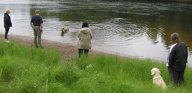 En hund jobbar i vattnet medan en annan är passiv